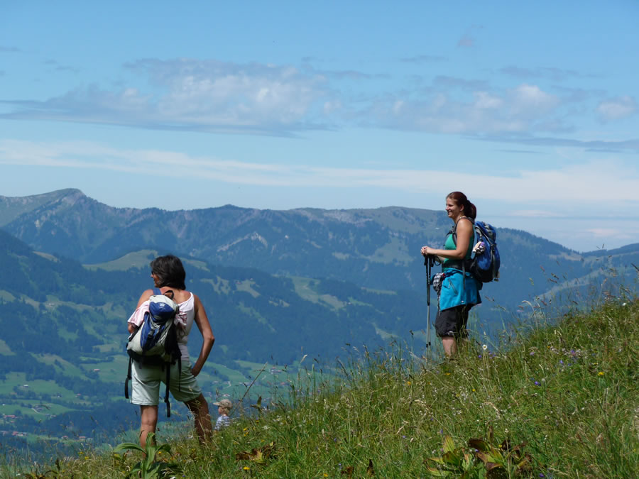Blick auf Oberstdorf. Das Ruhihorn flankiert die östliche Talseite des Oberallgäus. Vom Gipfel hat man einen überwältigenden Blick auf Oberstdorf und das ganze Tal. Auf das Rubihorn führen zwei beliebte Stecken, über die Ausläufer des Nebelhorns, Seite Oberstdorf und die Strecke über das Gaisalpgebiet, hier befindet sich auch die Untere Richteralpe.